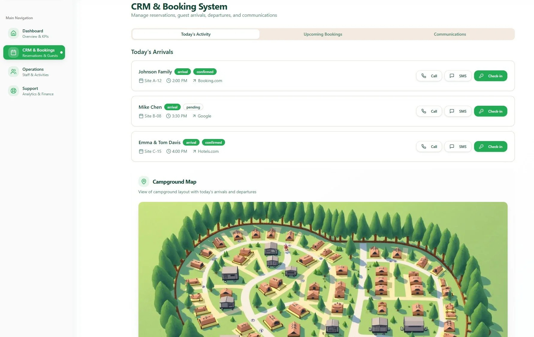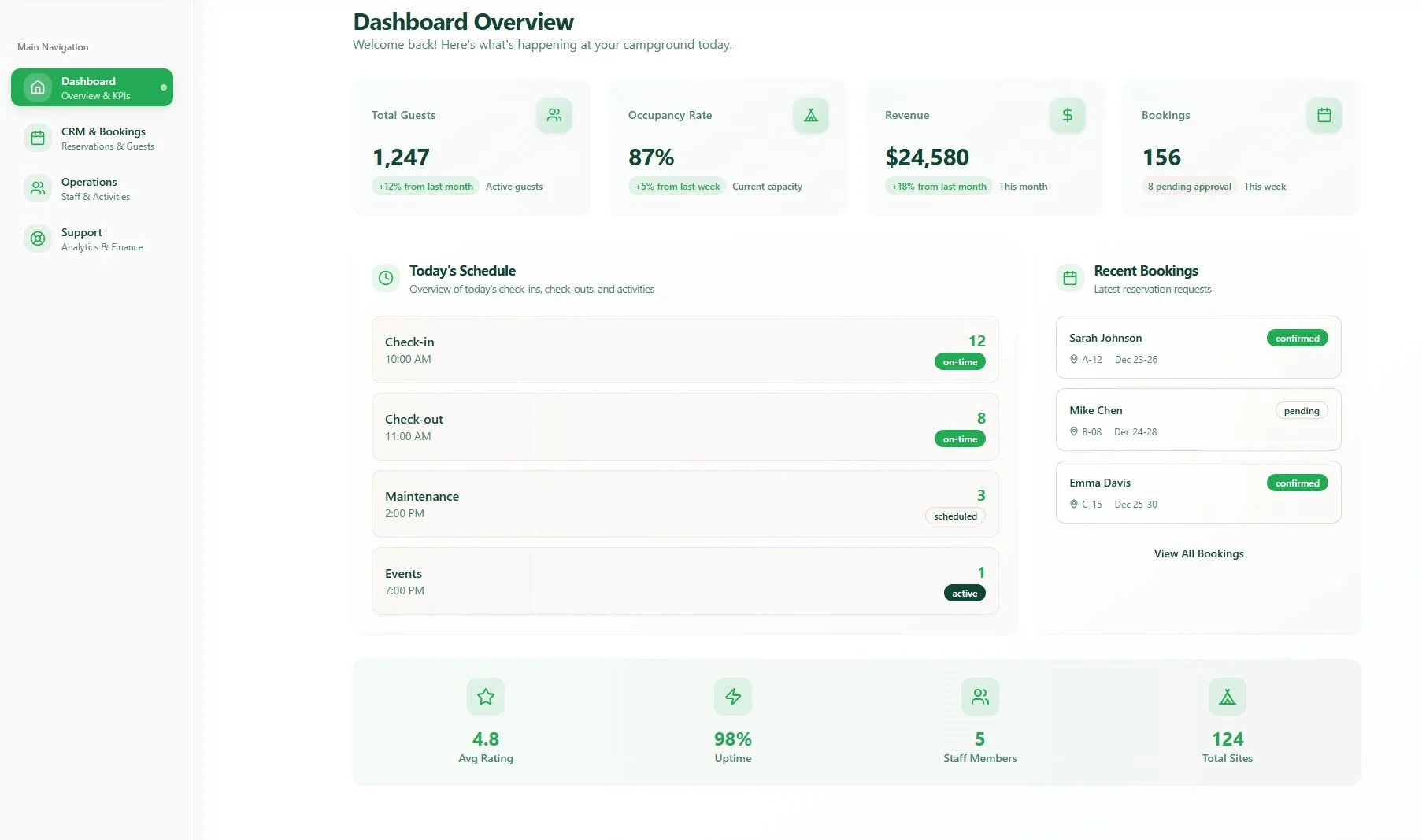 Se hele din campingplads på ét skærmbillede: belægning, indtægter, nøgletal og dagens aktiviteter. Dashboardet giver dig kontrol på sekunder.